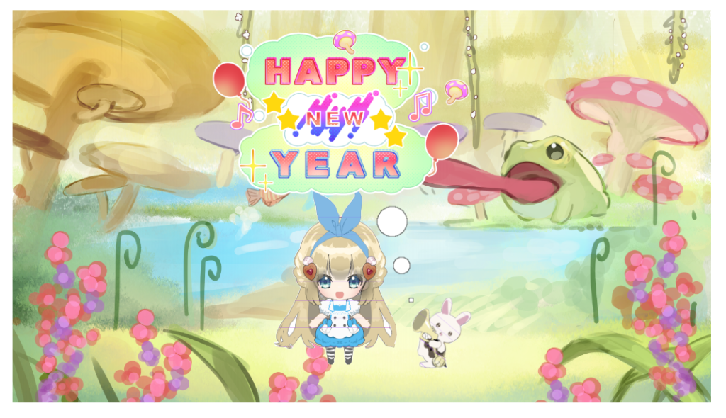 2023年の年賀状動画は、「生き生きと可愛く」というテーマを軸に、不思議の国のアリスをモチーフとした世界観を丁寧に描き出しました。